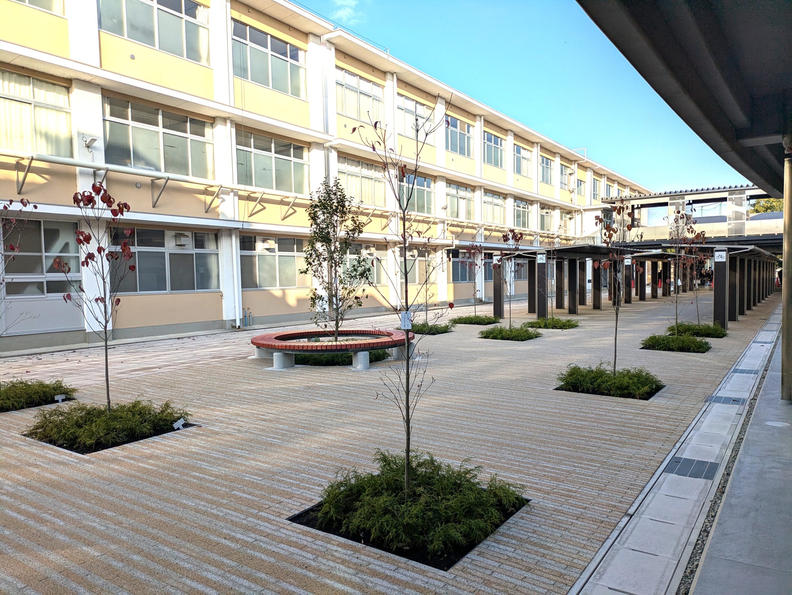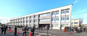 12月23日加茂高の終業式後、14時から新校舎玄関前で竣工式が来賓に教育委員会教育次長らを招いて、テープカットには同窓会長も参加し10名で、開催されました。